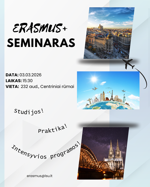 Primename, kad prašymus dalyvauti ERASMUS+ programoje ir semestrą praleisti užsienio universitete arba atlikti praktiką užsienio institucijoje galite pateikti LSU informacinėje sistemoje iki kovo 8 d.